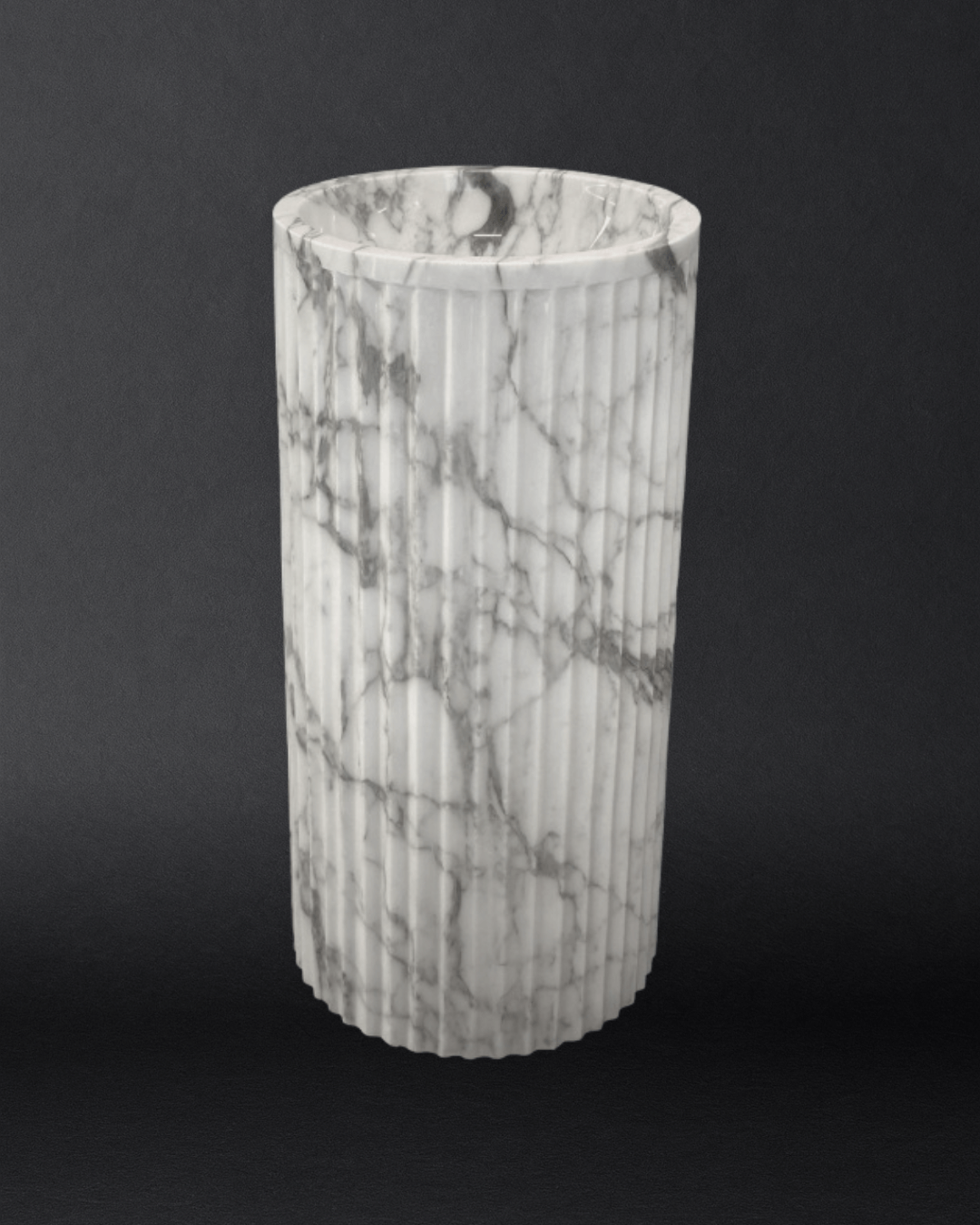 Exuding classical charm with a modern edge, FLUTED FINESSE celebrates the timeless beauty of vertical lines carved in luxurious Statuario White marble. The fluted cylindrical form adds architectural depth and textural sophistication, making it an ideal choice for refined interiors seeking subtle grandeur.