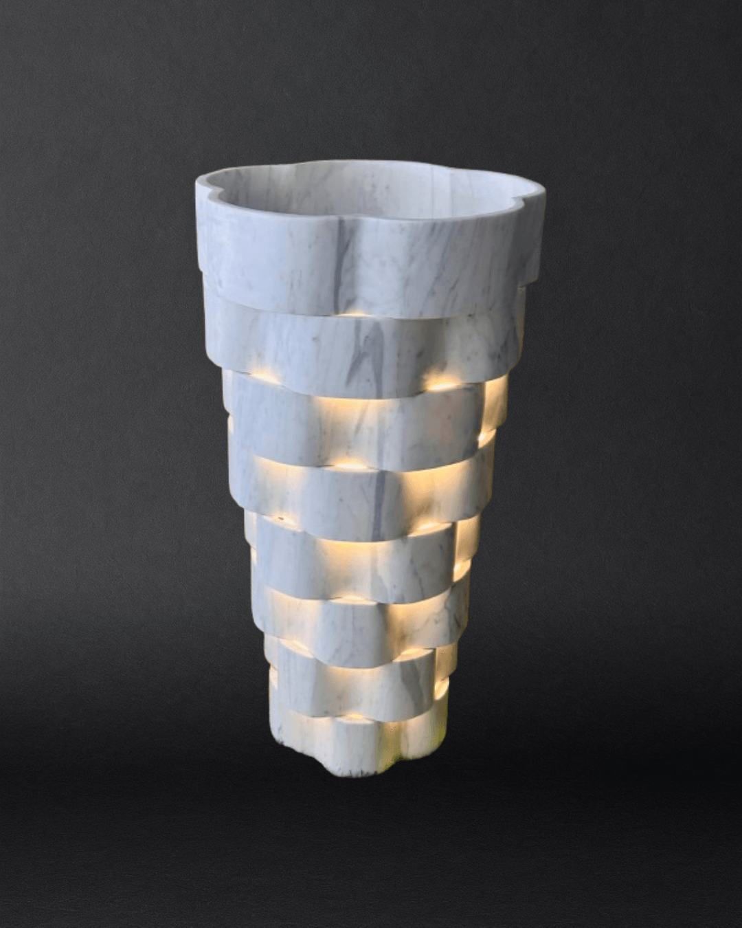 The INTRICATE ILLUSION basin is a visionary blend of craftsmanship and creativity. Sculpted in layered curves and subtly lit from within, this piece transforms natural Statuario White marble into a glowing work of art. Its tiered, petal-like structure evokes organic elegance while casting a warm ambiance—ideal for luxury powder rooms or spa-inspired spaces.