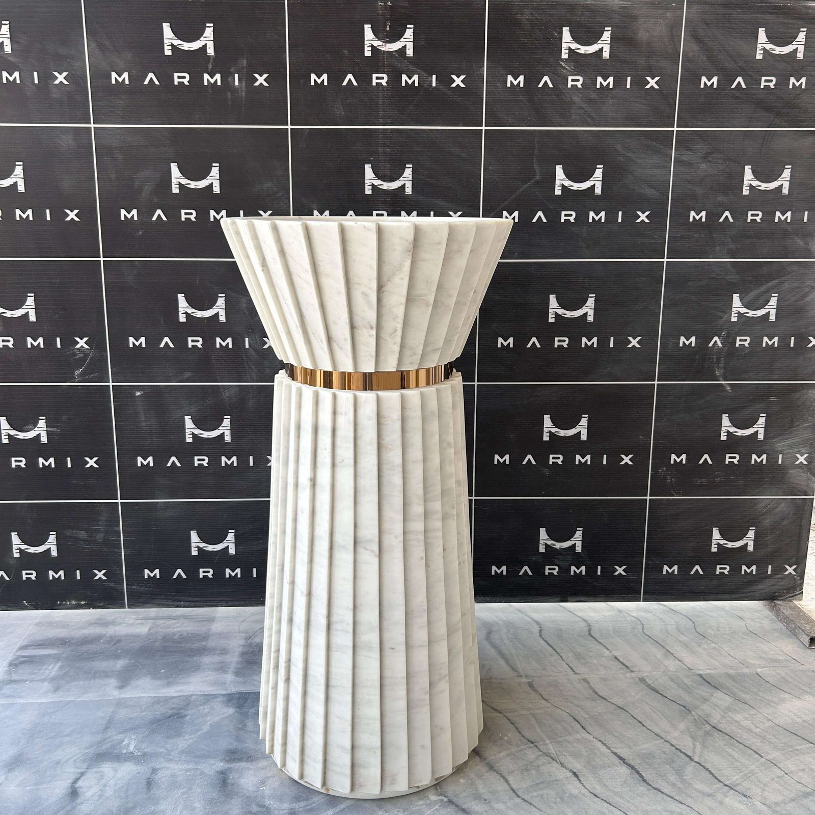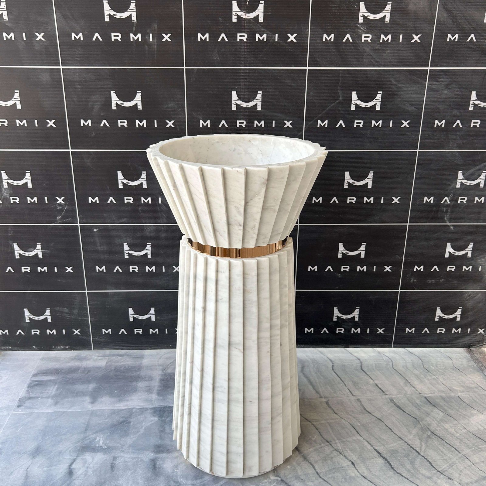 The NUVŌ basin redefines modern luxury with its bold yet harmonious design, crafted from the pristine Banswara White marble. Its fluted upper bowl and lower pedestal are elegantly united by a slender gold accent band, creating a seamless blend of texture and refinement. This freestanding basin is a perfect fusion of classical craftsmanship and contemporary flair, ideal for elevating bathrooms with a touch of timeless sophistication.