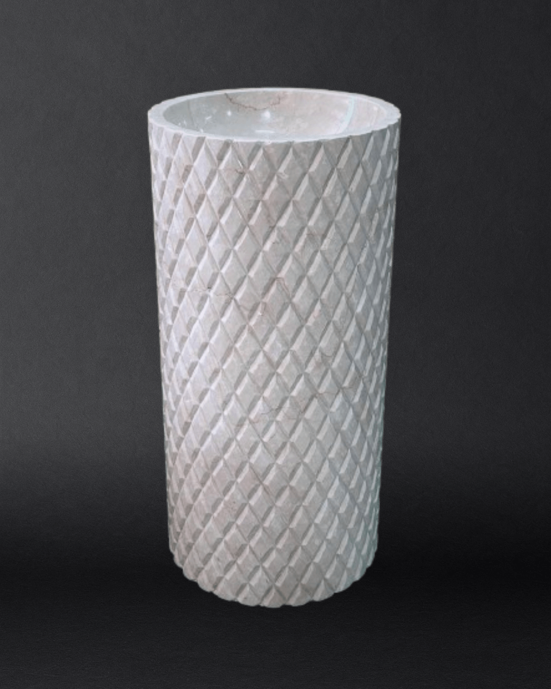 With its crisp diamond pattern carved in relief, PINNACLE GRID offers a tactile elegance that feels both contemporary and timeless. Hand-chiseled from warm Botticino Beige marble, this pedestal basin elevates geometry to art, ideal for interiors that celebrate refined craftsmanship.